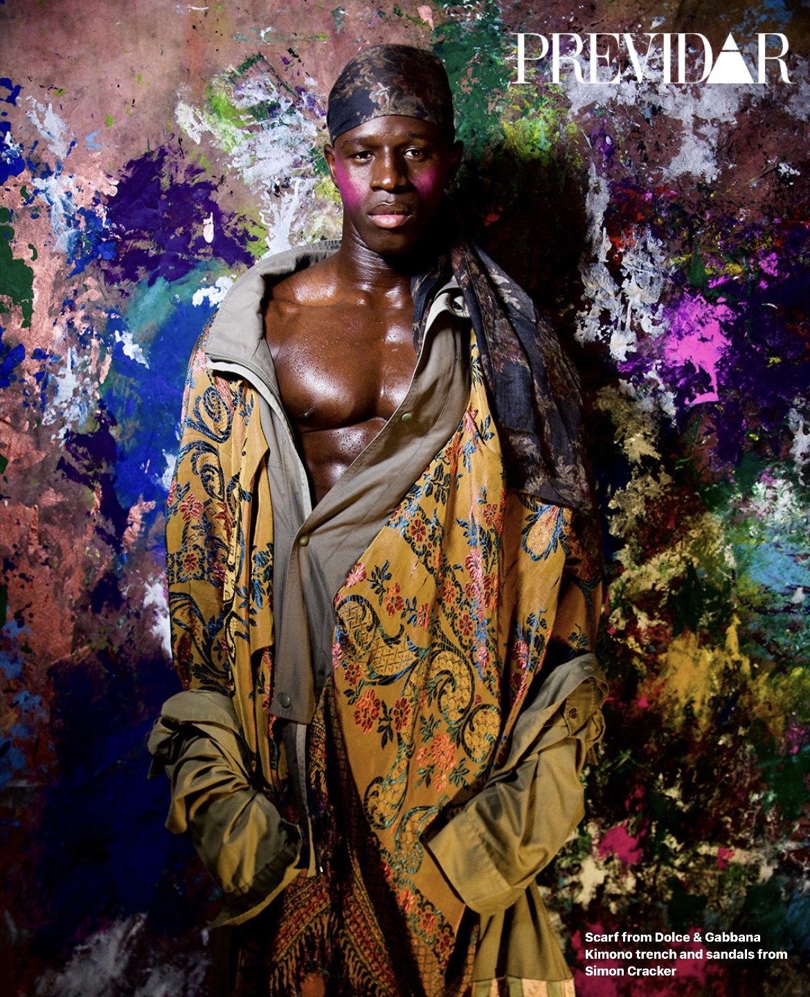 The Italian lensman’s photoshoot ushers in with a picturesque image of fashion model Laye Dabi, stunning in a tropical Kimono trench from luxury fashion brand, Simon Cracker’s 2024 Spring/ Summer collection. Adhering to the artistic theme of the shoot, the model is adorned with hot pink face paint on his cheeks. His contradictory stylistic approach symbolises rebellion and audacious boldness – both of which are integral characteristics of lyrical abstraction.