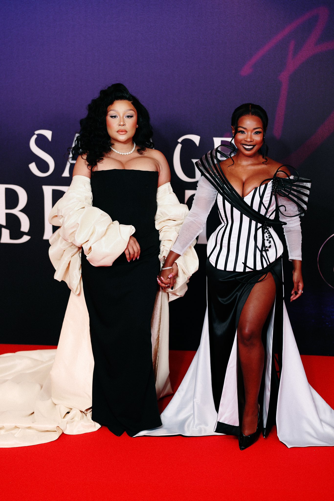 ‘Savage Beauty’ actress Rosemary Zimu stunned in a black gown with a sculpted golden bodice. Meanwhile, fellow co-star Angela Sithole looked ravishing in a black and white gown.