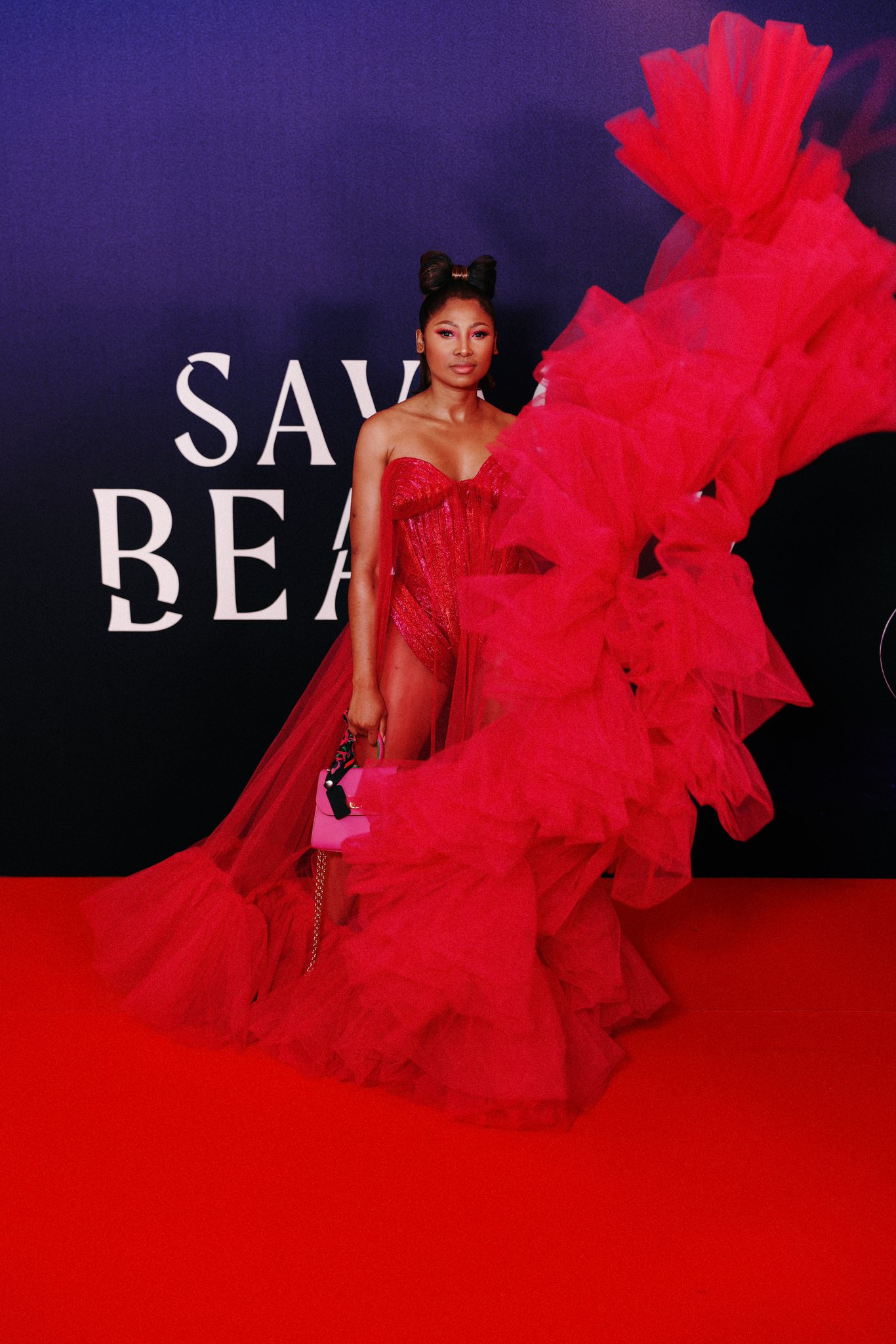 Well attended by industry film industry tastemakers, the red carpet boated fierce fashion moments. Actress and entrepreneur Enhle Mbali looked like a dream scarlet red tulle dress emblazoned with lace.