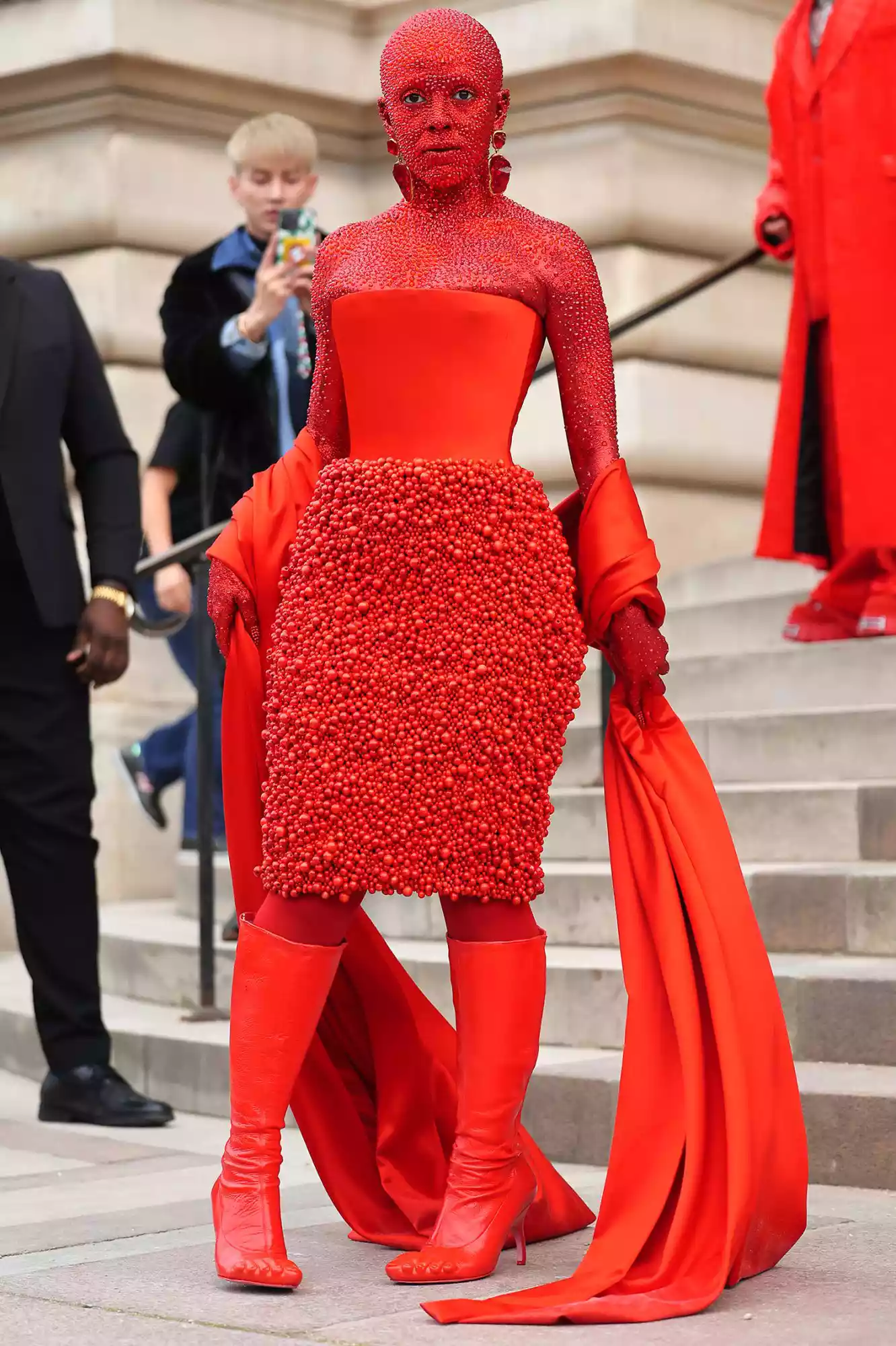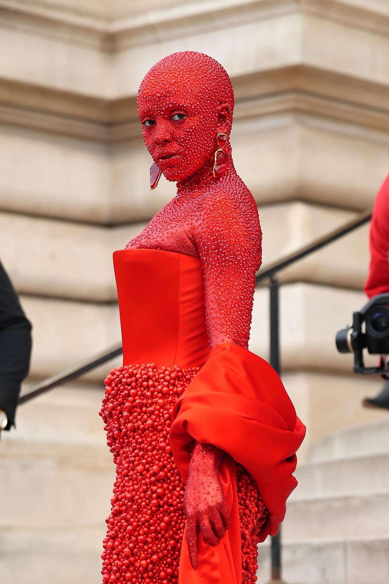 Doja Cat turned heads at the Schiaparelli Haute Couture fashion show during Paris Fashion Week in a jaw-dropping ensemble that featured 30,000 hand-placed Swarovski crystals. While her actual outfit consisted of a red silk faille bustier, a hand-knit skirt made of lacquered wooden beads, and trompe l’œil toe boots, it was the red crystals covering the singer’s head, chest, and arms that made the look instantly iconic.