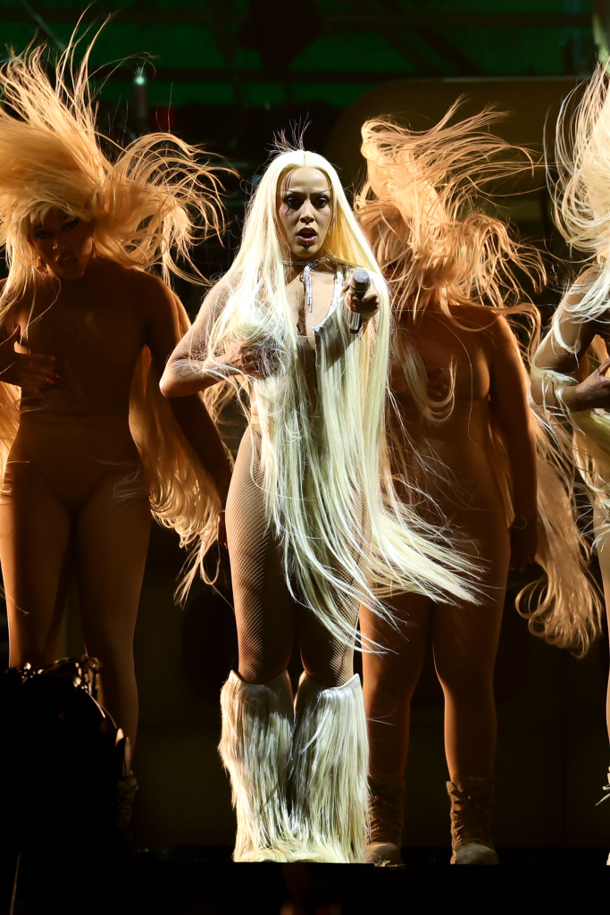 While Coachella fashion has long been associated with flower crowns and boho silhouettes, Doja Cat paved the way for all of the weird fashion lovers out there. The star embodied a Hairy Goddess in a blonde bodysuit and matching boots, making a bold fashion statement.