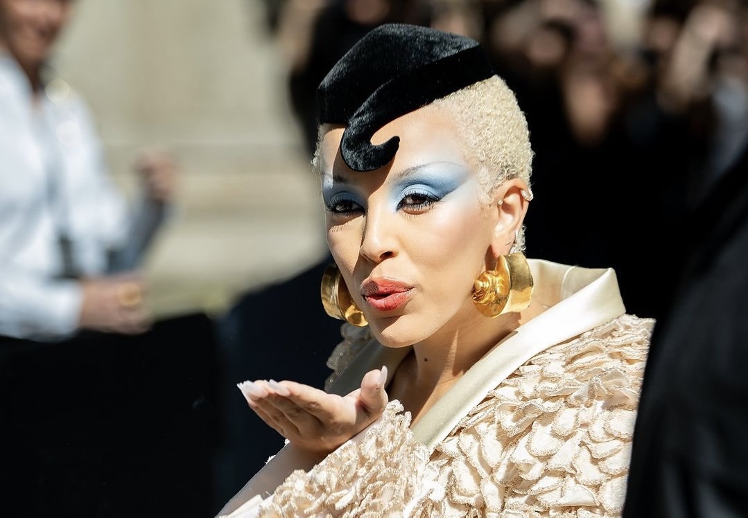 Arriving at the Schiaparelli Autumn/ Winter 2024 show in Paris, Doja Cat went for a woman’s power suit silhouette, with oversized, bold shoulders. Underneath the blazer, she wore a neutral bustier and a miniskirt paired with tights and sandals with a ball on the bottom of the heel.