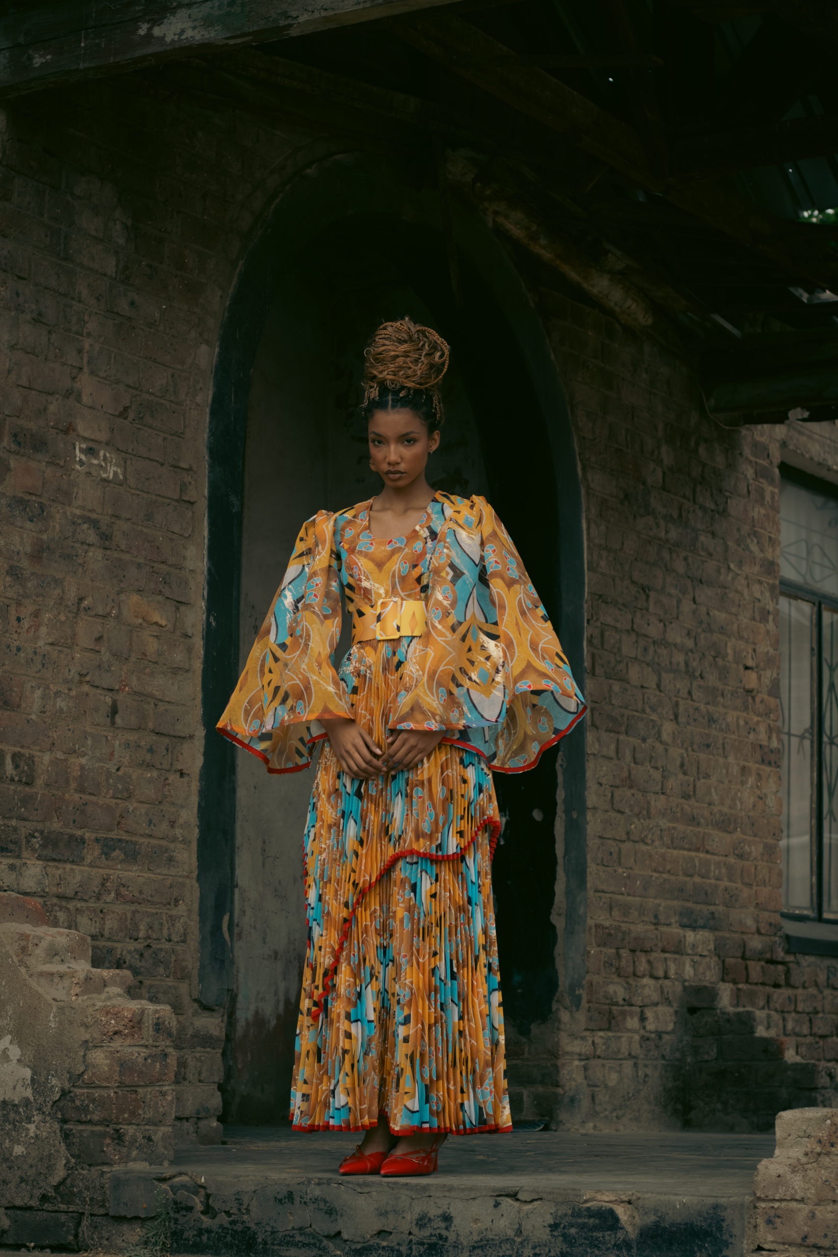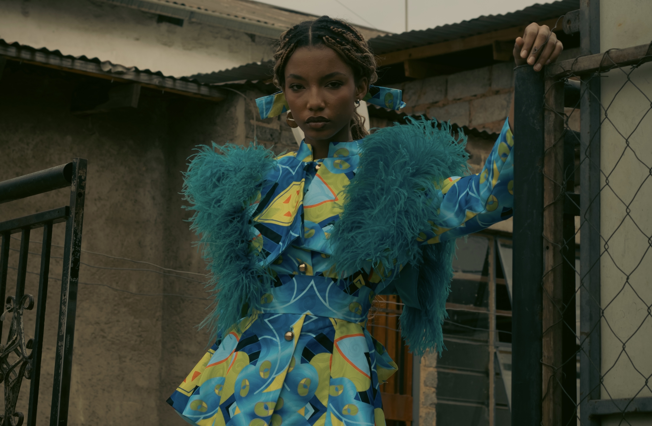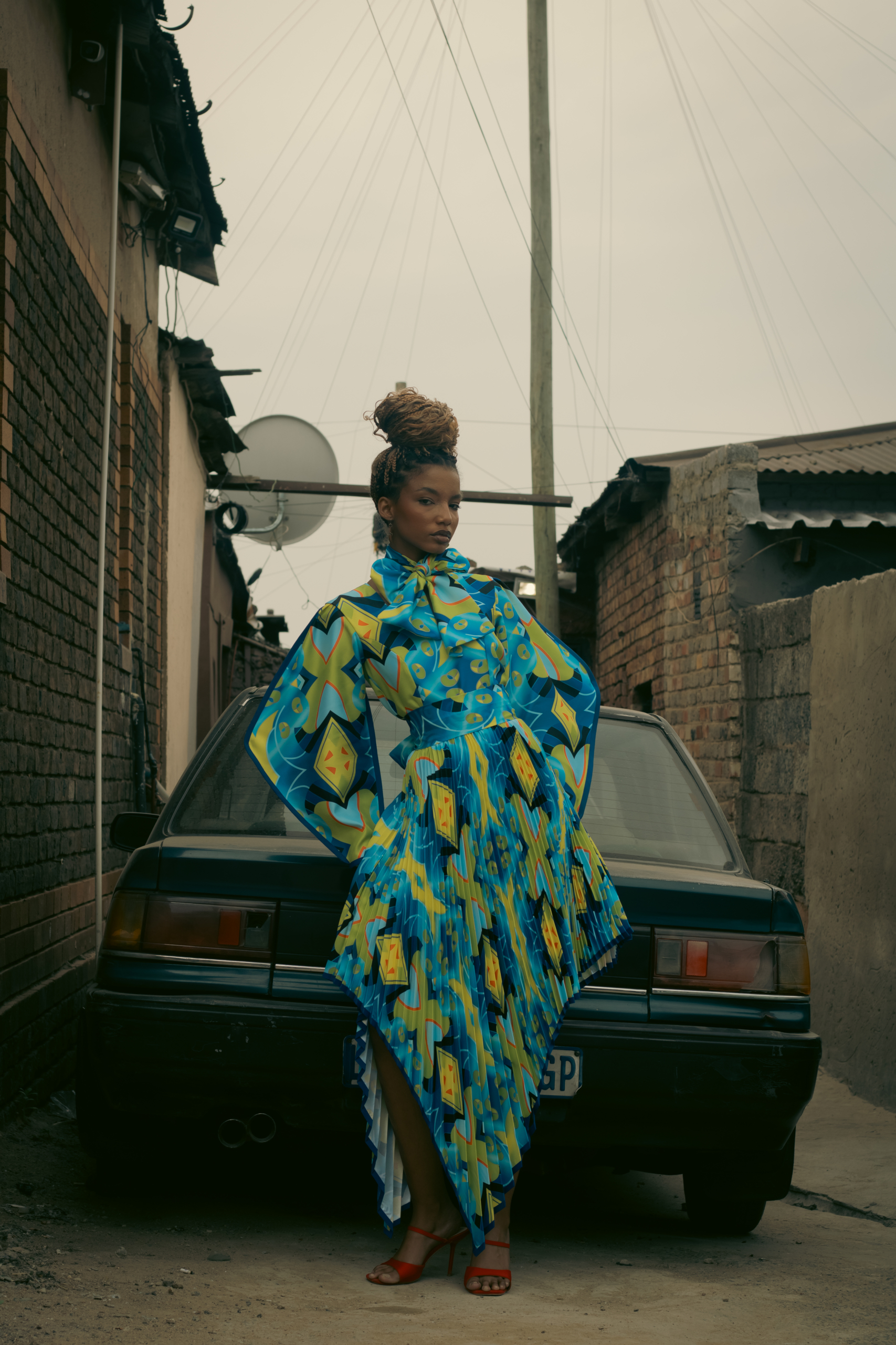 • Details that honour township ingenuity—pleats, wraps, headpieces—while presenting them in the language of high fashion.