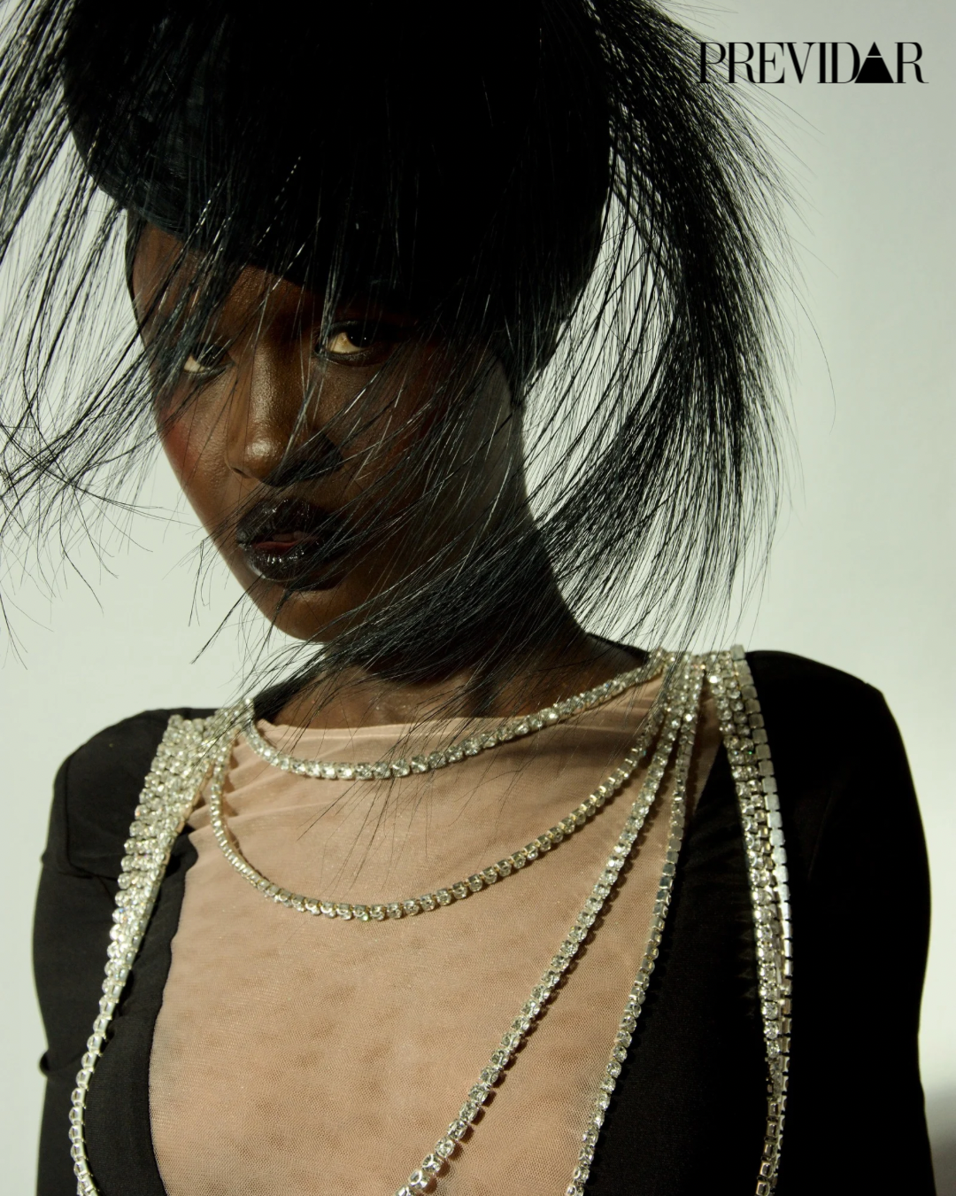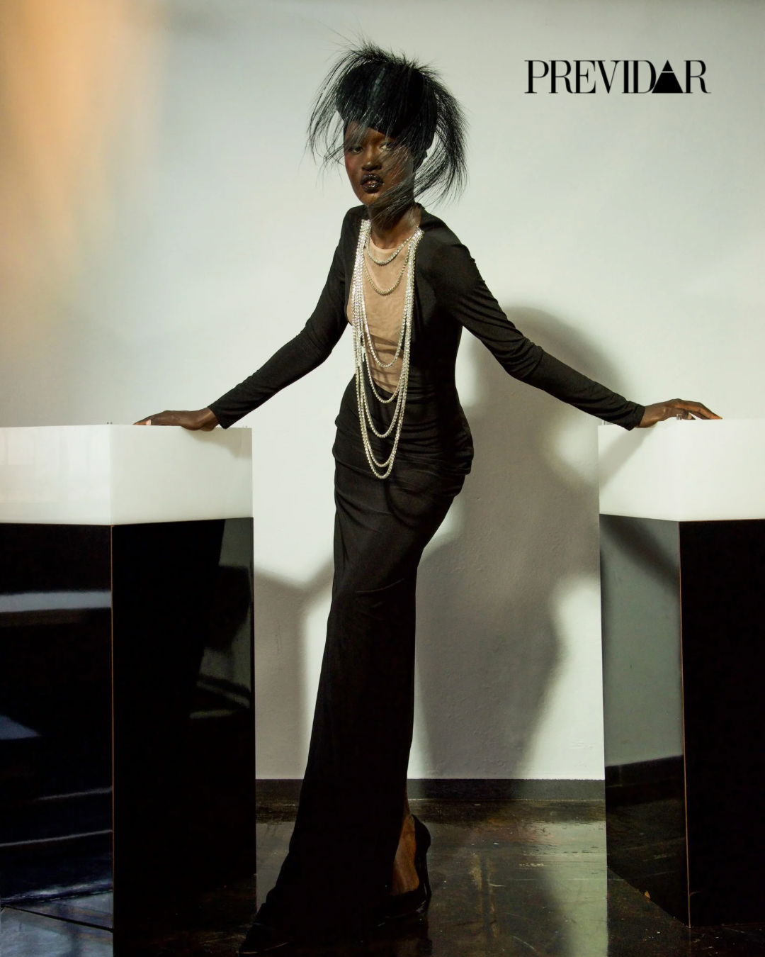 The setting itself is stripped back, modern yet intimate, placing the focus firmly on the clothing’s graphic power and the model’s commanding presence. Leonardo speaks of location and light as characters of their own: “Lighting is crucial, as it creates a specific mood or atmosphere — warm and cozy, or cool and dramatic. It sets the tone for the story.” In this case, the story reads as a nocturnal play of elegance, with each shadow, fabric fold, and pearl strand performing their role with precision.