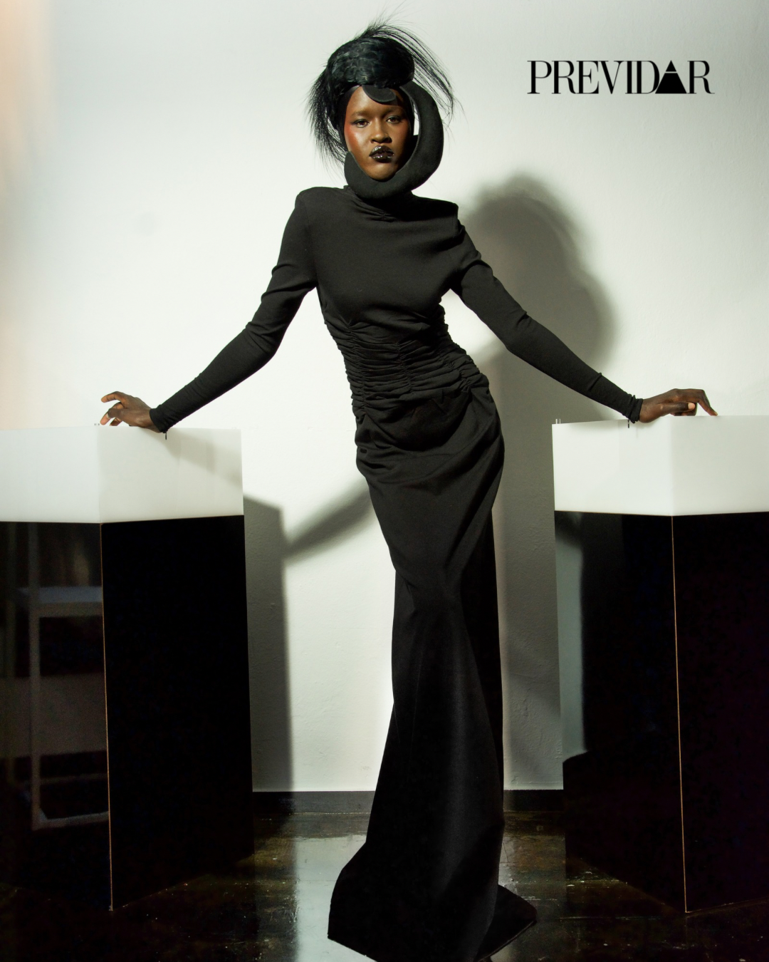 In this editorial, Leonardo doesn’t just shoot garments — he brings them to life. His direction embraces mood as much as silhouette. Rich black fabrics gleam under carefully calibrated lighting, veils blur the line between allure and mystery, while sculptural headpieces transform models into living architecture. “I use composition, lighting, and posing to bring the clothes to life, allowing the clothing to shine through the model’s performance,” he explains.