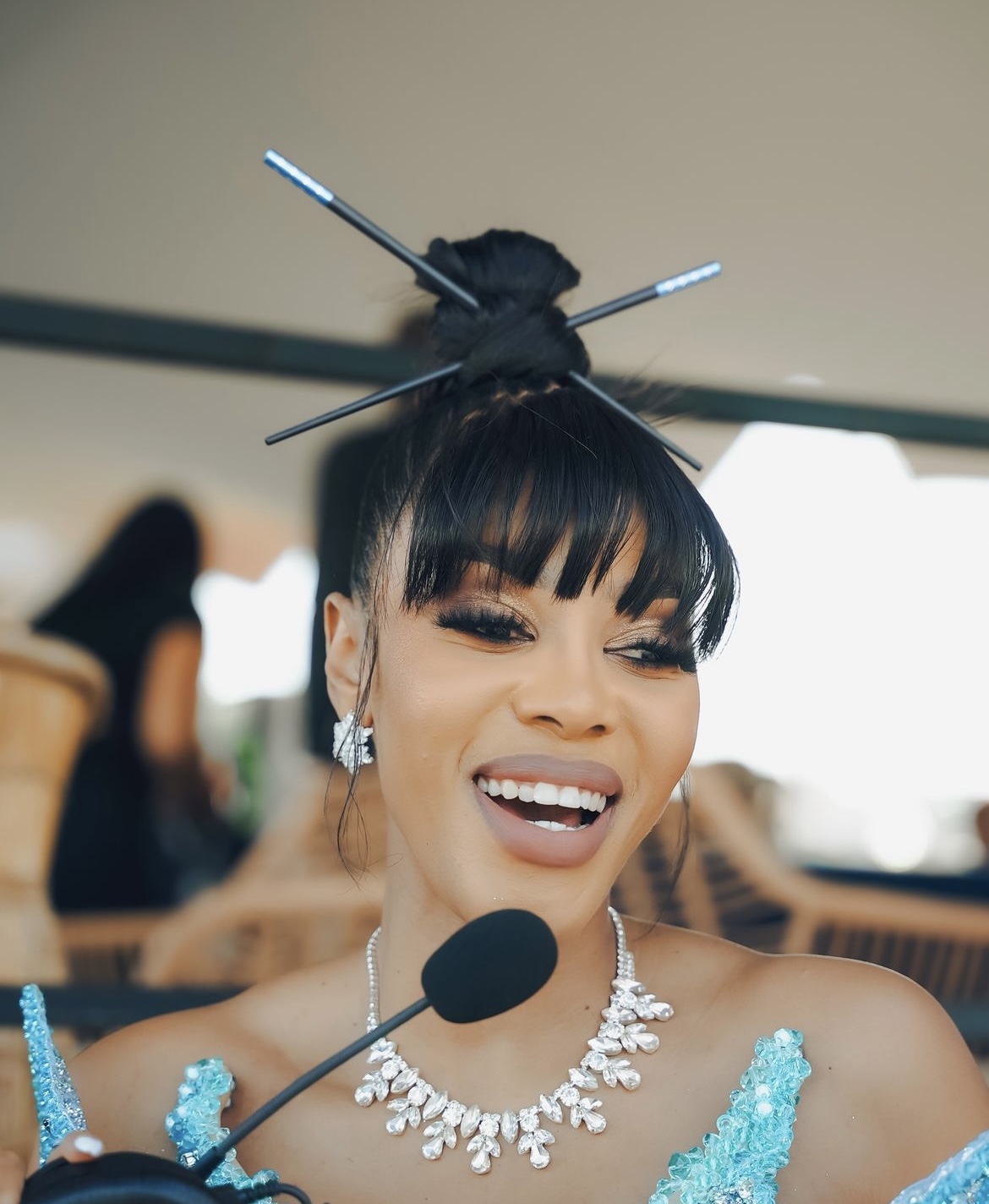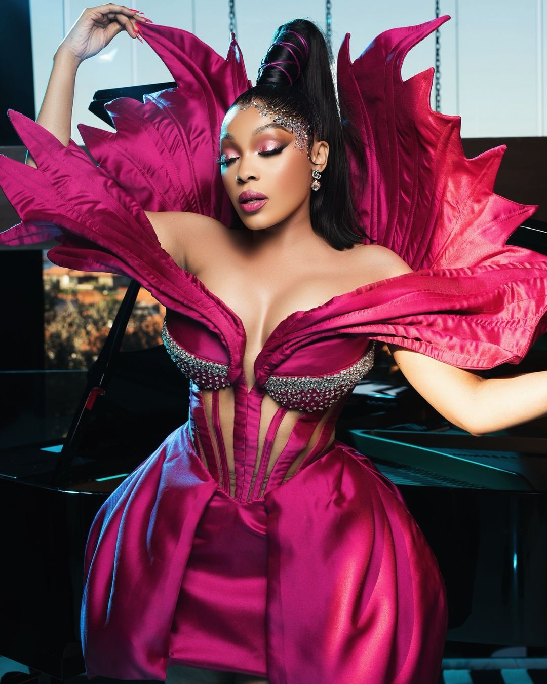This architectural up-do was a total transformation from media personality, Sithelo Shozi’s notoriously minimalistic hairstyles. The pairing of the maximalist hairdo with a gilded monochromatic make-up look? Genius!