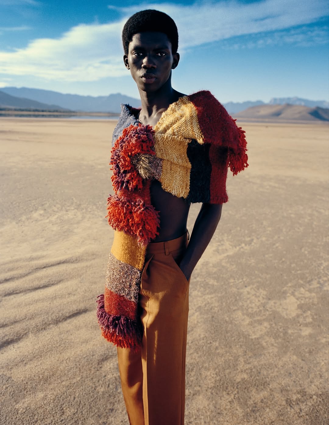 Mdingi’s garments often explore duality: masculinity and softness, tradition and modernity, strength and vulnerability. Fluid tailoring, generous silhouettes and tactile surfaces form the foundation of his aesthetic, inviting the wearer into a sensory experience. Knitwear crafted from locally sourced mohair, layered textiles and hand-finished detailing speak to a reverence for material integrity and artisanal skill.