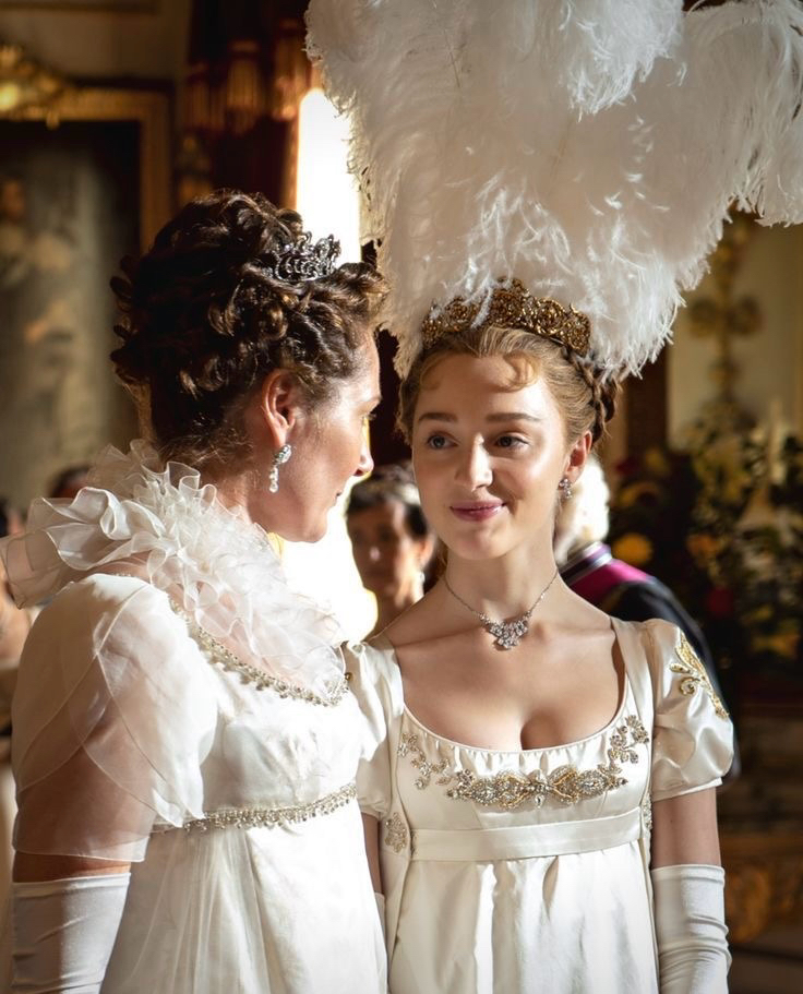 Eloise Bridgerton, ever the rebel, debuted in a crisp white gown with a feathery accessory in place of a tiara—a bold choice that mirrored her defiance of societal norms. Where Daphne dazzled in diamonds, Eloise made a statement with simplicity, and we loved every bit of it.