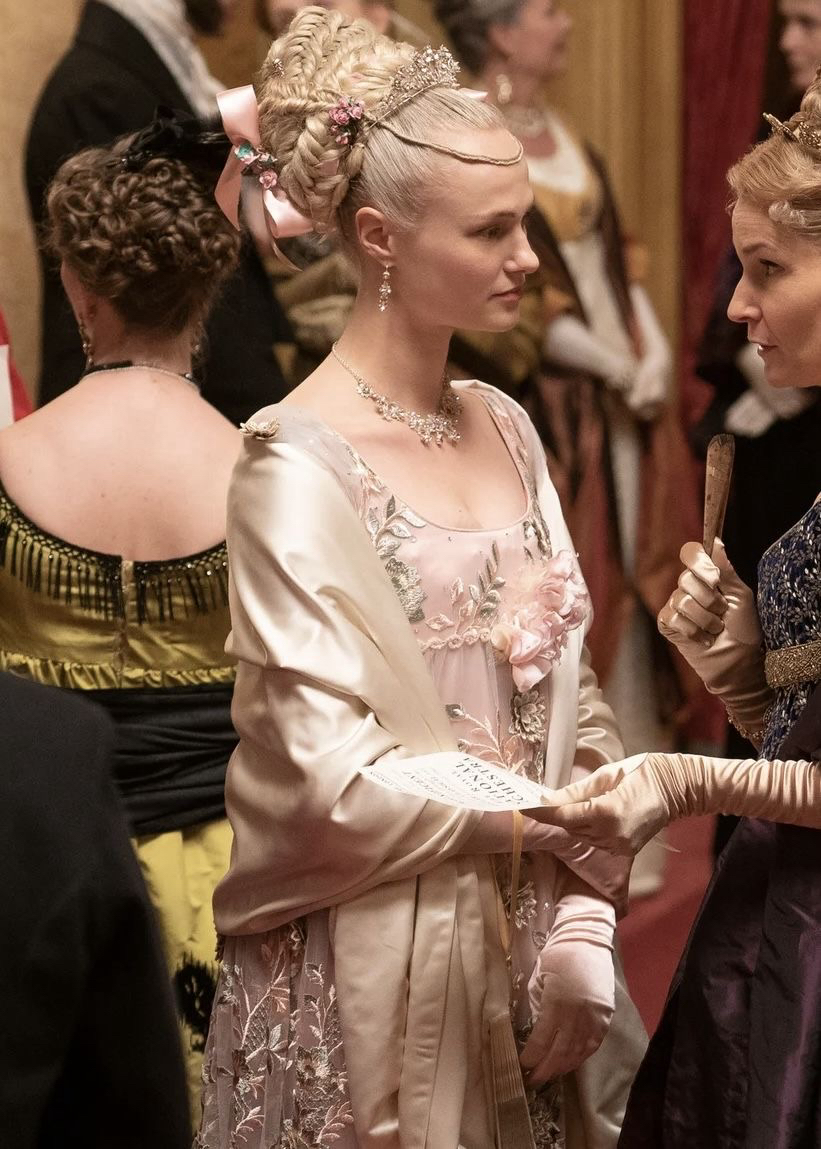 Cressida Cowper’s signature peach gown from season one remains a showstopper. The pastel floral embroidery, accented with lilac appliqué flowers, and complemented by peach silk gloves, created a look that was both whimsical and aspirational. Her intricate updos, adorned with crystals, lace, and flowers, only added to her ambition for social dominance, making her a style force to be reckoned with.