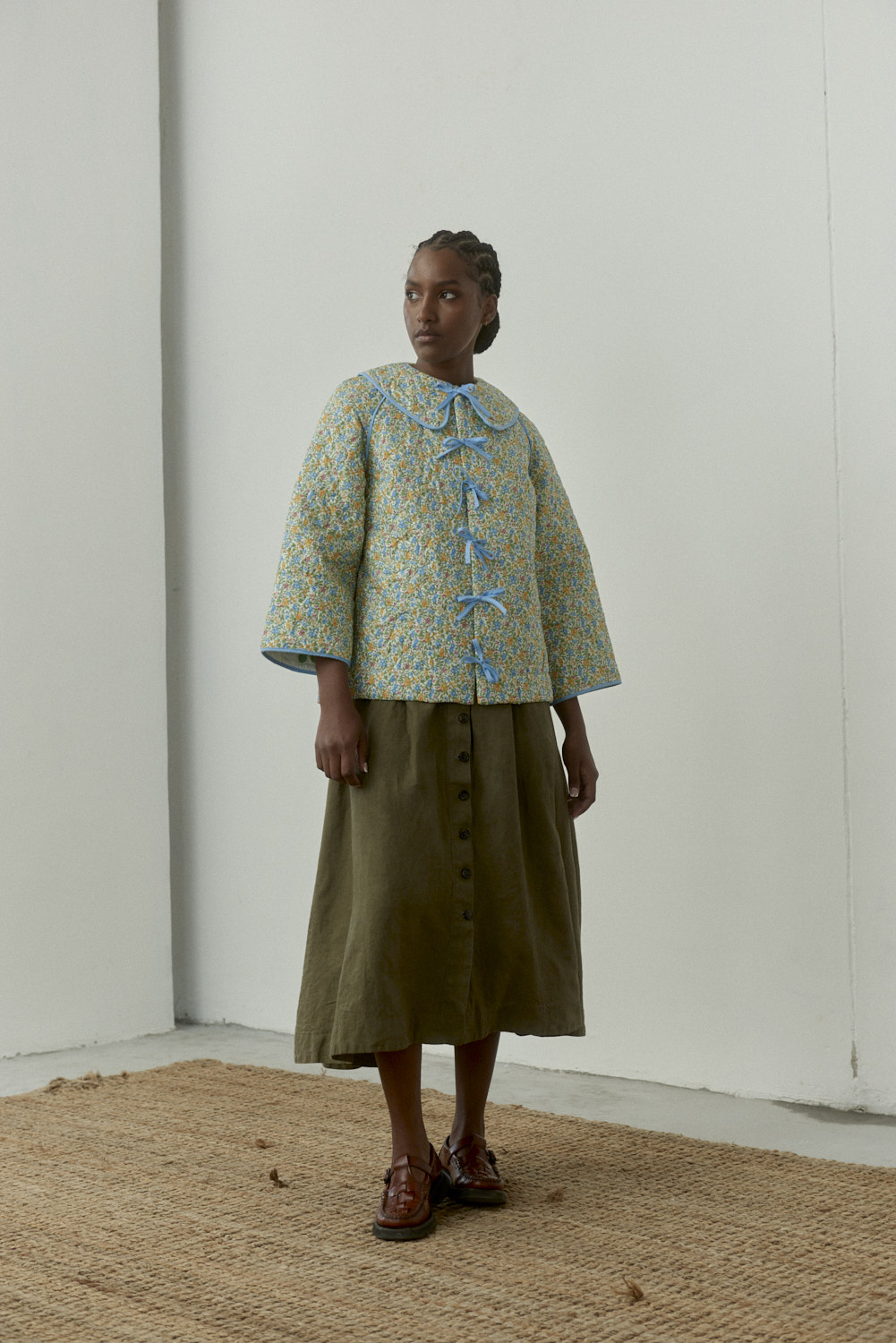 Woven into the brand’s DNA is a deep commitment to celebrating women’s stories. Taking pride of place on the shop floor is In Full Bloom, a vibrant, joyful collection that honourssisterhood and shared heritage. Drawing inspiration from the women in Khumalo’s life, past and present, the collection merges Cape Town-made embroideries with hand-block prints from Jaipur, blending South African and Indian craft traditions. True to Khumalo’s signature style, the prints are a love letter to colour, shaped by her travels to India and Morocco last year. There, the boldness and pride of the artisans she met left a lasting impression. Featuring hues of turmeric, rose and sage, the colours of the collection take inspiration from the rich hues of Marrakech’s souks and the colourful array of spices, pottery and tapestry.