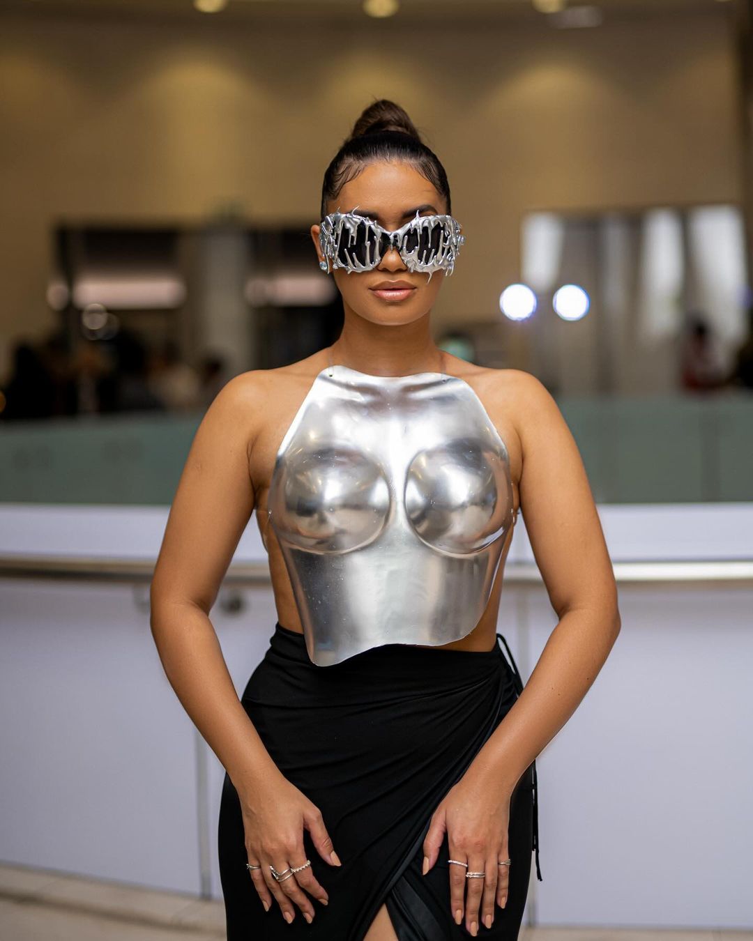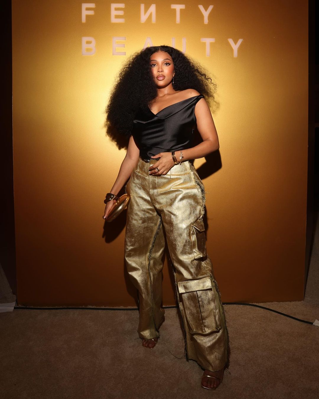 We can’t over multimedia powerhouse Linda Mtoba’s metallic renaissance fashion moment at the Fenty Beauty Soft’lit Luminous Longwear foundation launch in Los Angeles.