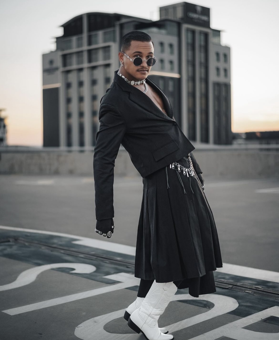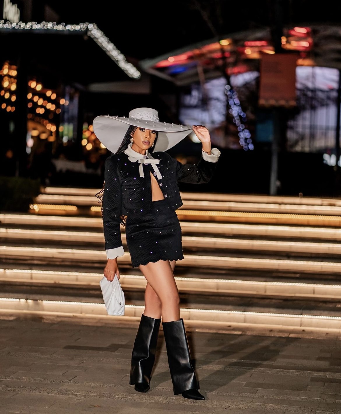 Digital creator and stylist set the tone for autumn and winter fashion with a monochrome, ultra-modern montage, styled with white cowboy boots at SA Fashion Week.