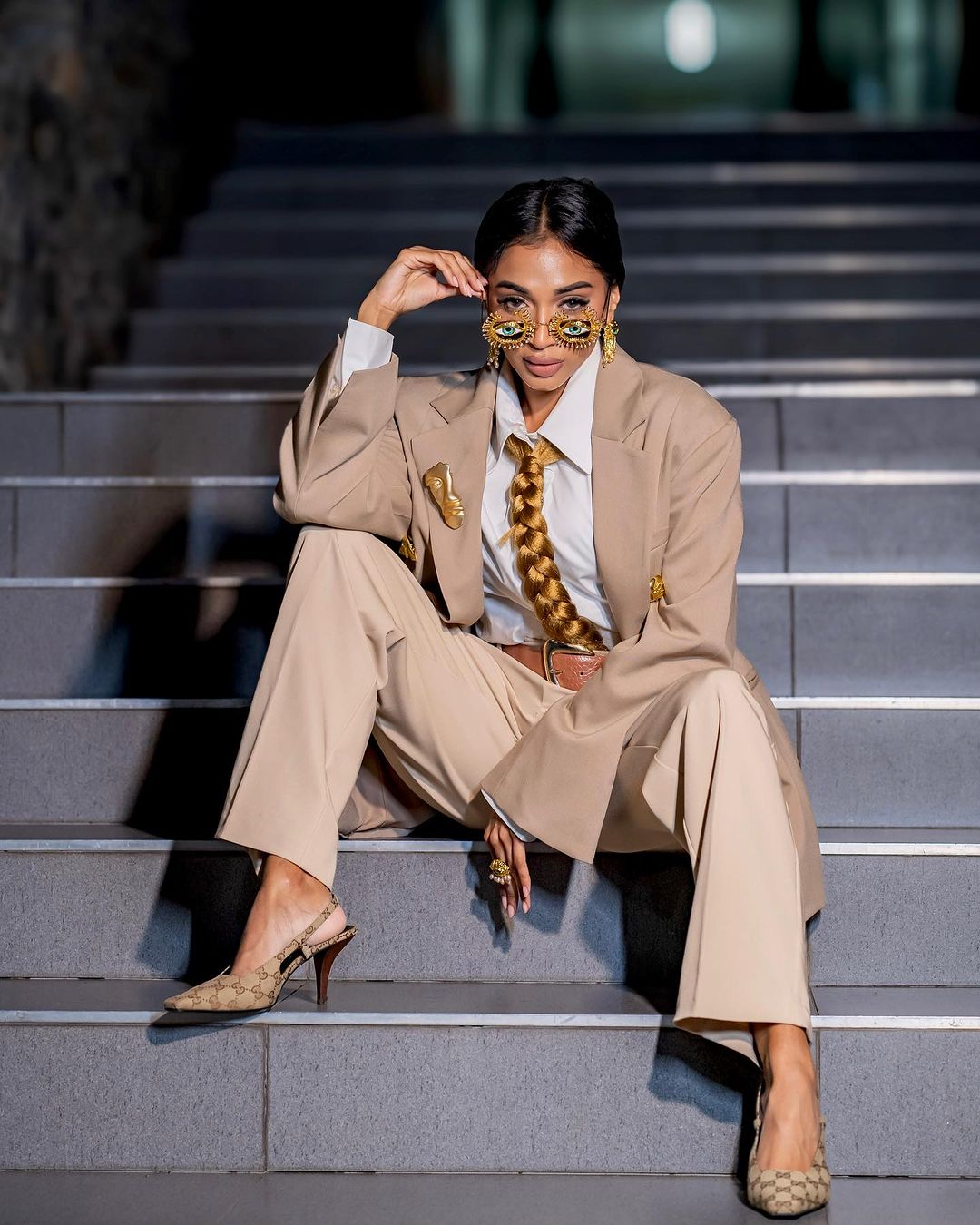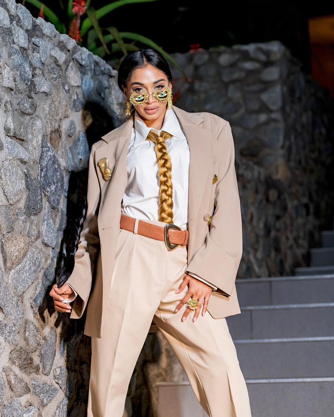 Influencer and style maestro Naliyani Uma brought Schiaparelli’s braided tie runway trend to life. The digital creator styles the New York Fashion trend with a chic suit and was on trend!